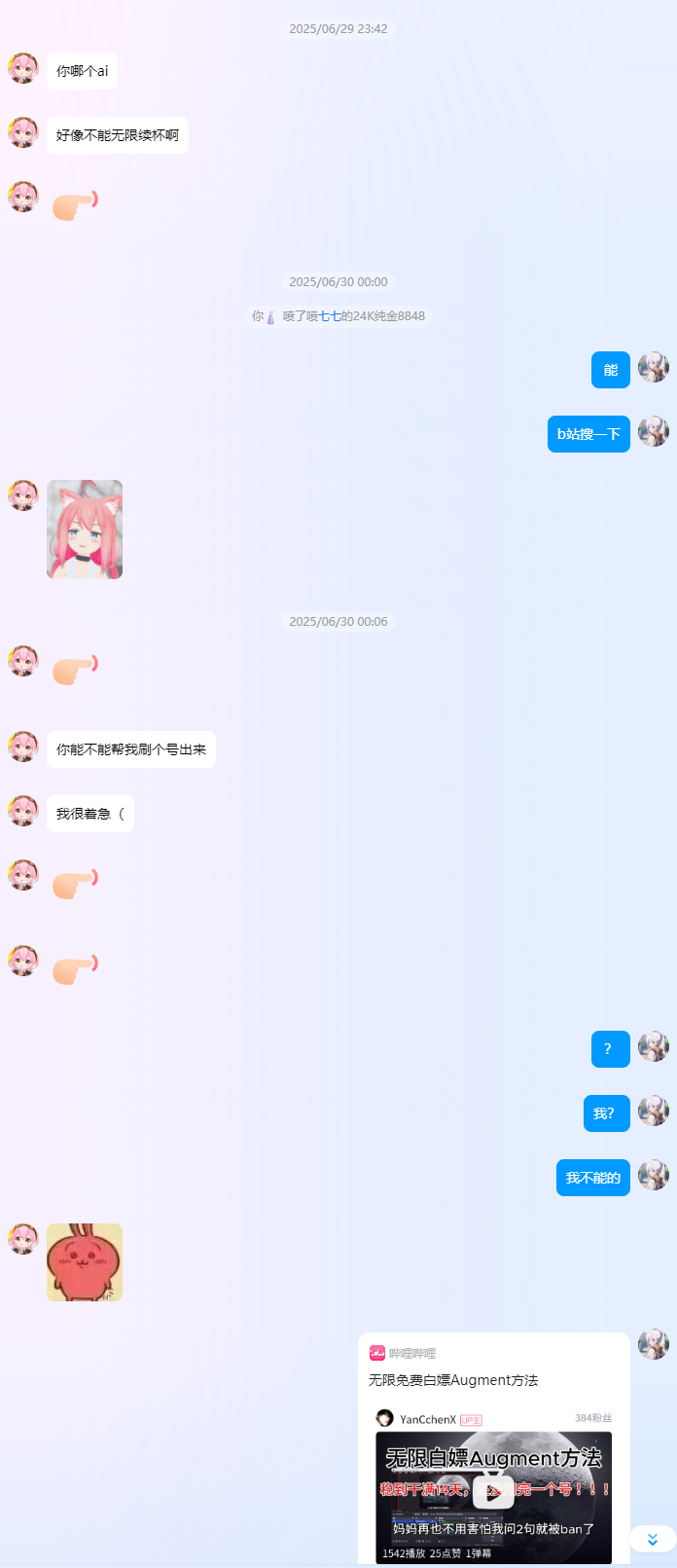 听风吟给他推荐了 DeepSeek AI 用来写插件,七七发现并不好用向我询问有没有好用的,我推荐了 Augment,然后他爱不释手了