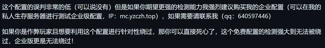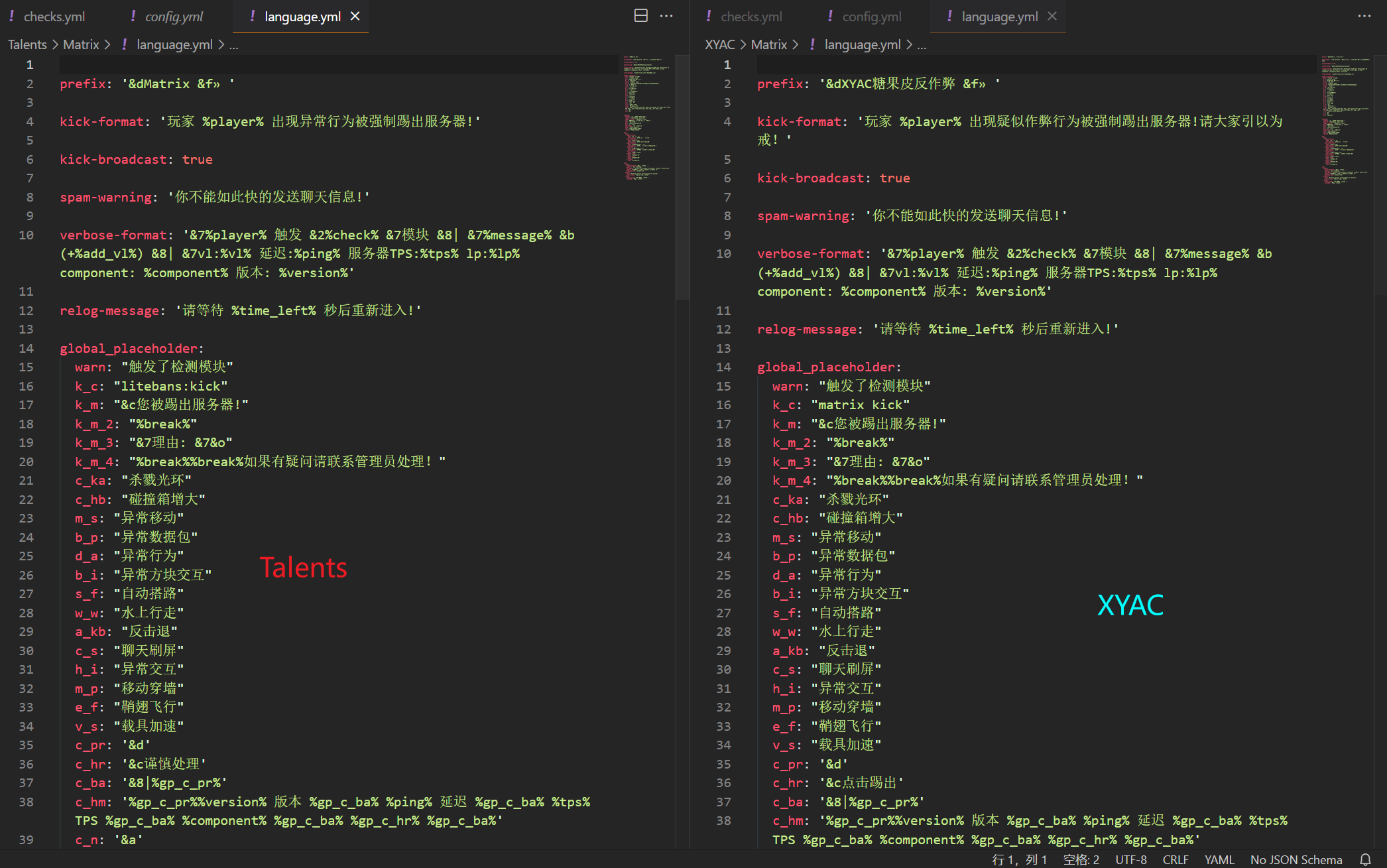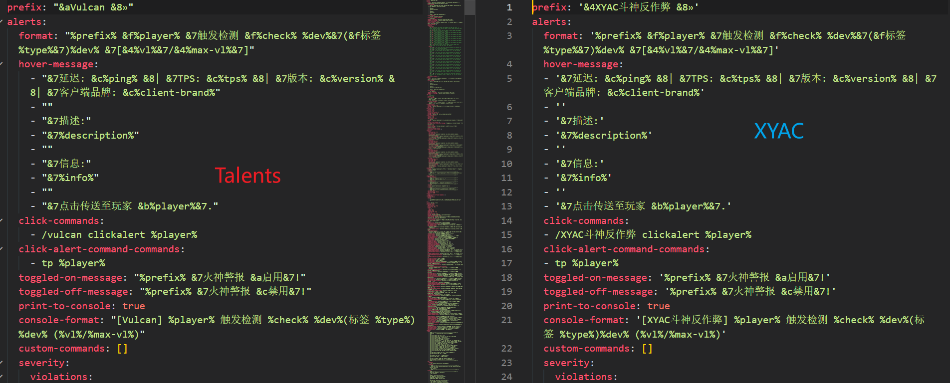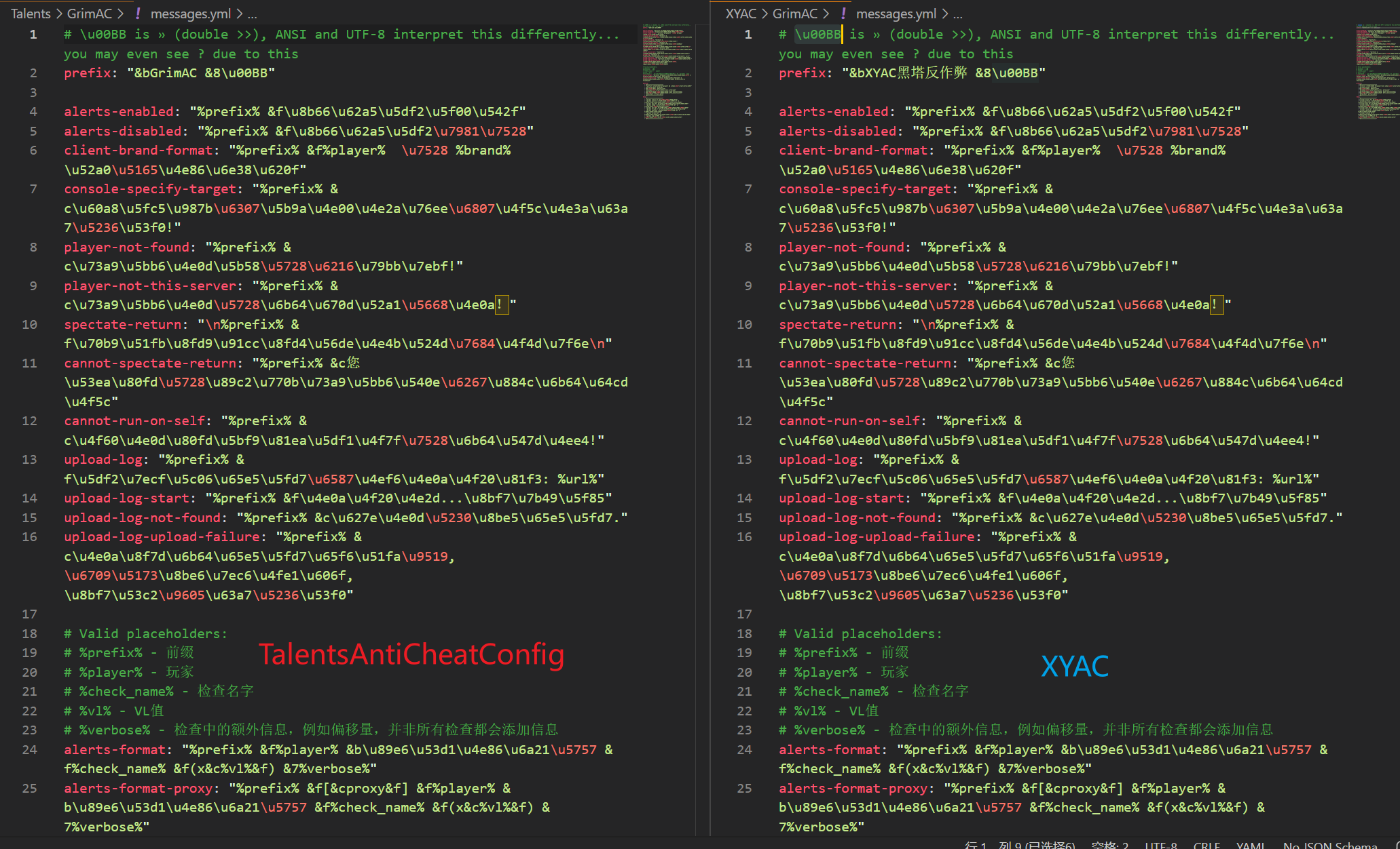 我配置的中文全部转换成了\u00BB(unicode)编码,因为这样在启动bat里不加-Dfile.encoding=UTF-8也能正常运行Grim的语言文件,不用-Dfile.encoding=UTF-8或者像我这样转码,Grim里的任何中文在低版本都会乱码,很显然XYAC这弱智根本不知道为什么要转成这个,而是直接套用我grim的语言文件,并把原先的 Grim 改成了 XYAC反作弊 来使用。