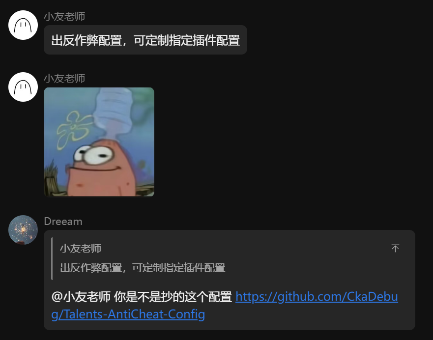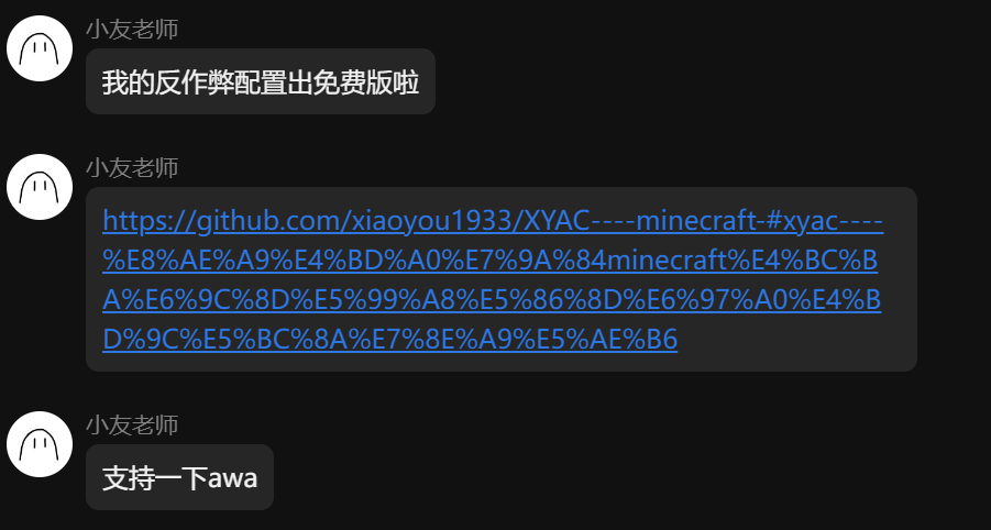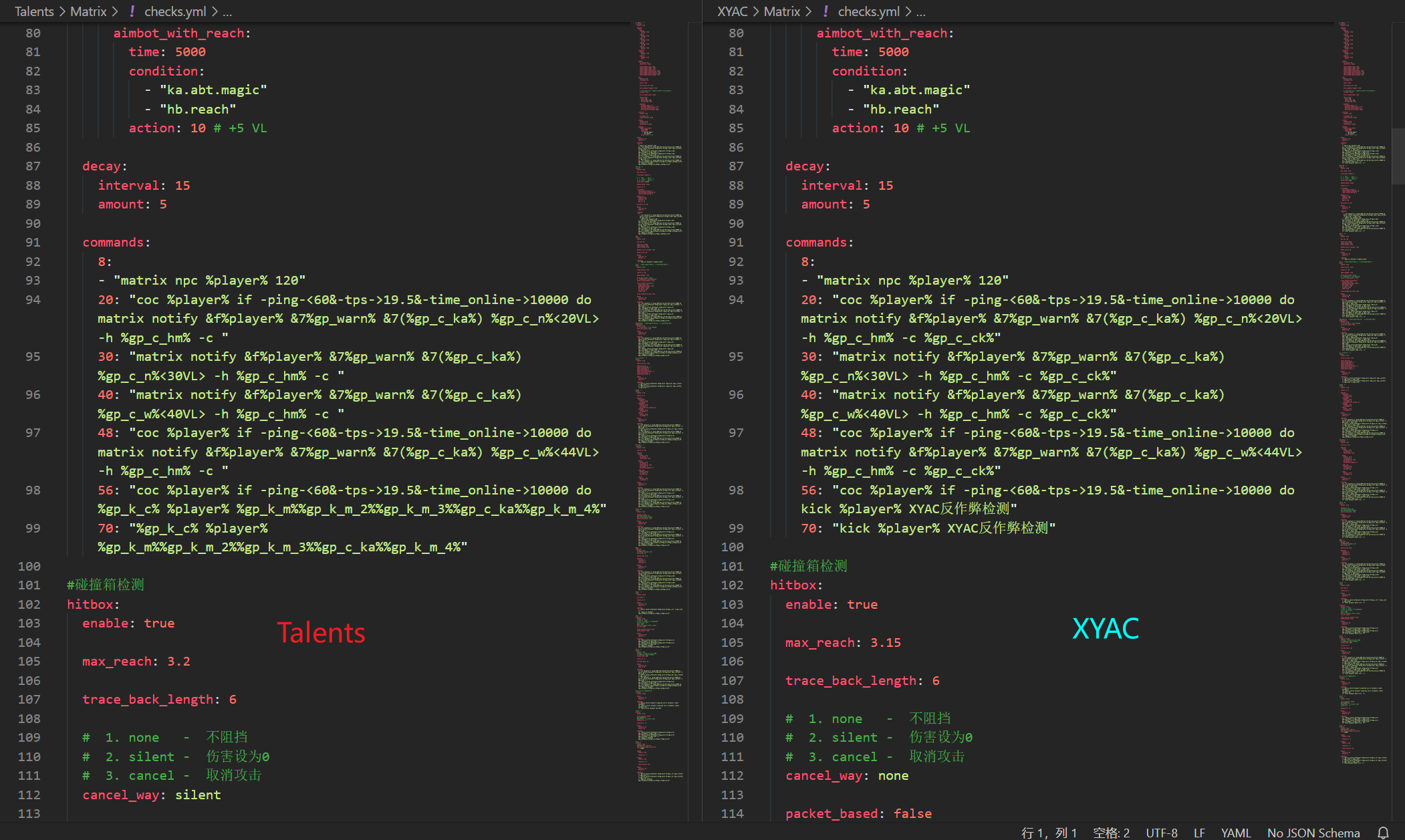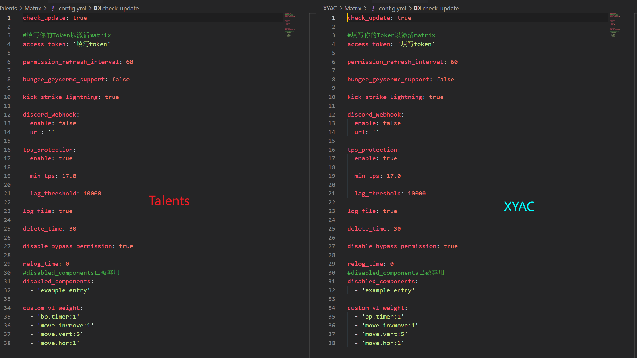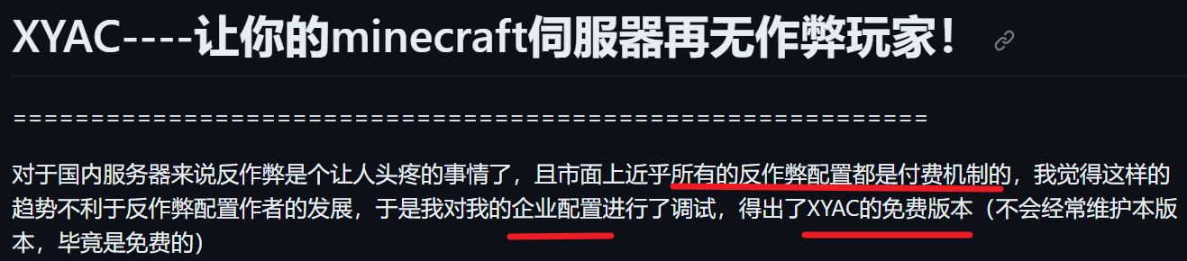 我配置的中文全部转换成了\u00BB(unicode)编码,因为这样在启动bat里不加-Dfile.encoding=UTF-8也能正常运行Grim的语言文件,不用-Dfile.encoding=UTF-8或者像我这样转码,Grim里的任何中文在低版本都会乱码,很显然XYAC这弱智根本不知道为什么要转成这个,而是直接套用我grim的语言文件,并把原先的 Grim 改成了 XYAC反作弊 来使用。