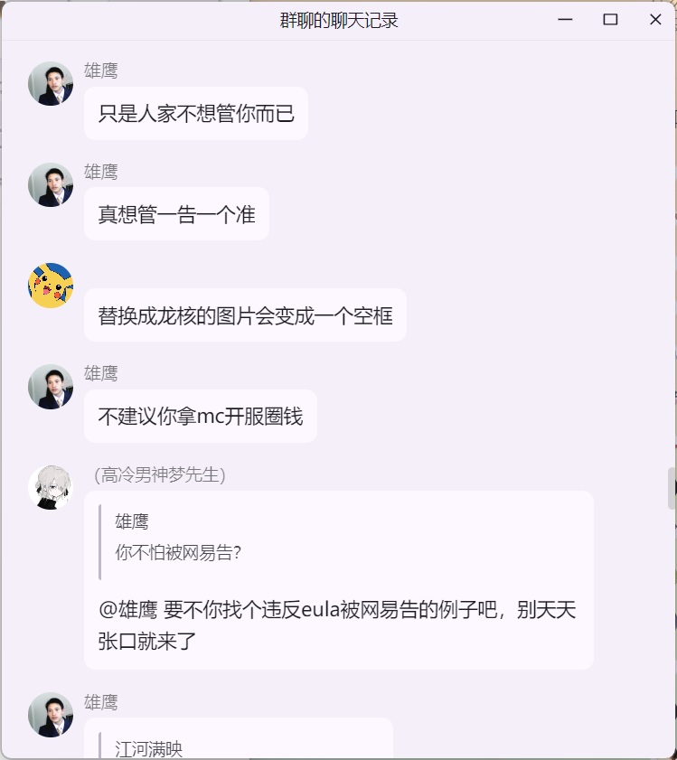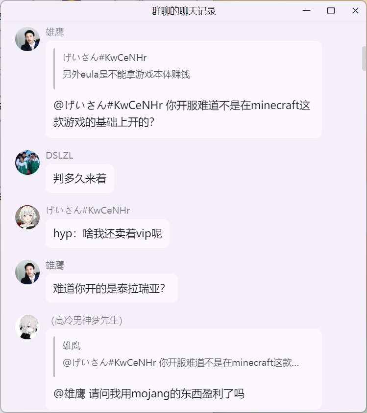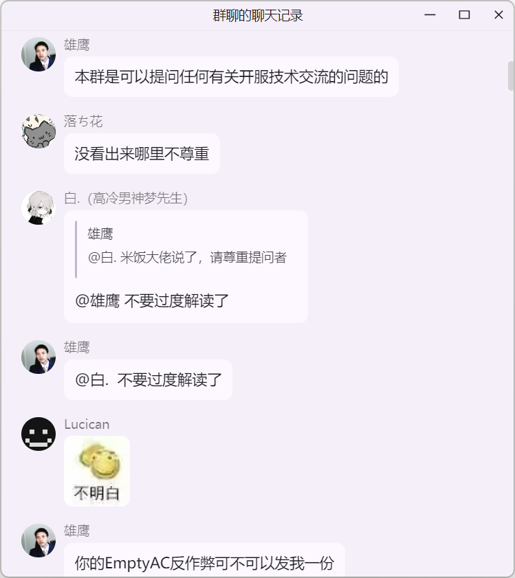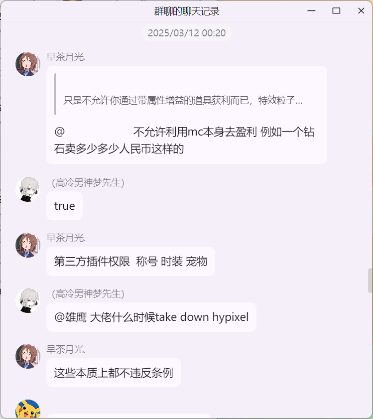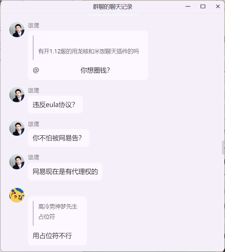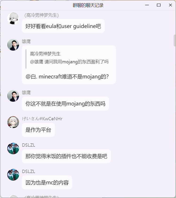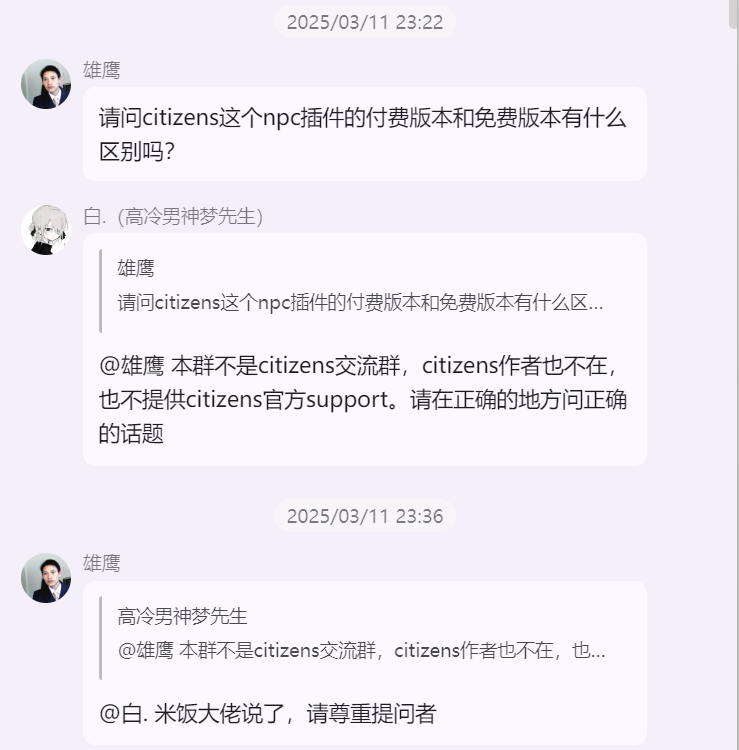 雄鹰大哥在 米饭的 mc 技术交流群 询问 Citizens NPC 插件“免费版 与 付费版”的区别时,白大佬提示雄鹰这里并适合讨论 Citizens 插件,随后发生如下事件
