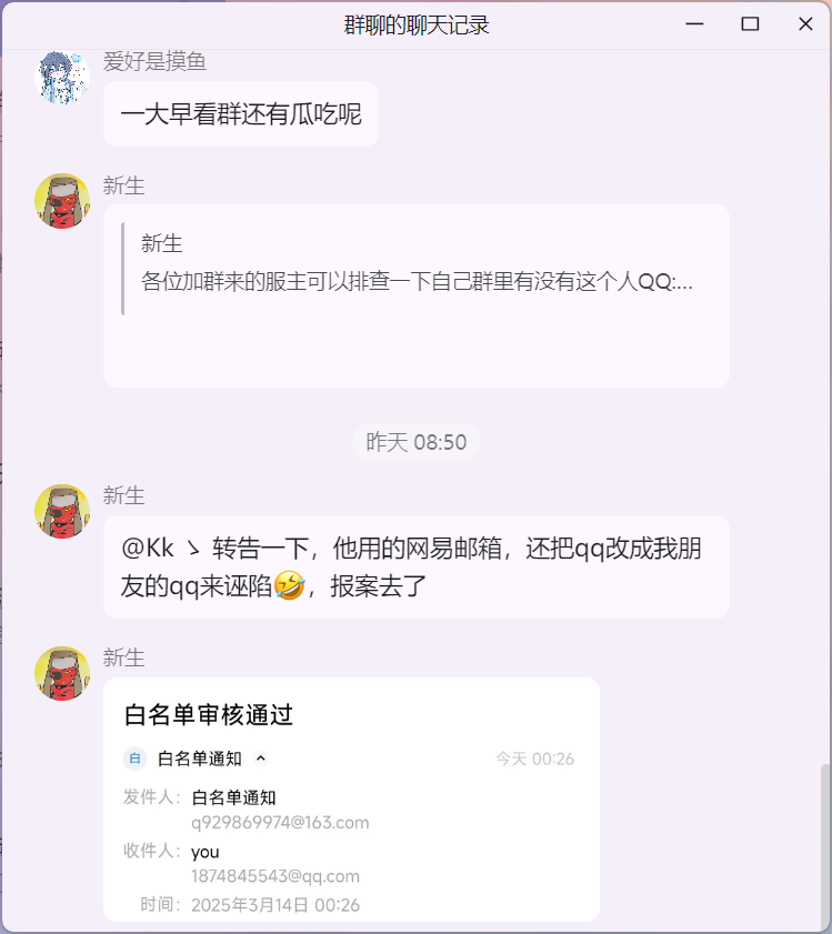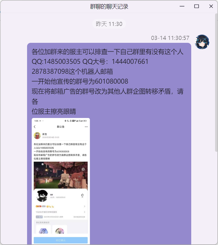 3 月 13 日,他使用某小号进入一个服务器群,随后获得该服务器群的群成员 QQ 并通过 QQ 邮箱形式宣传自己的服务器